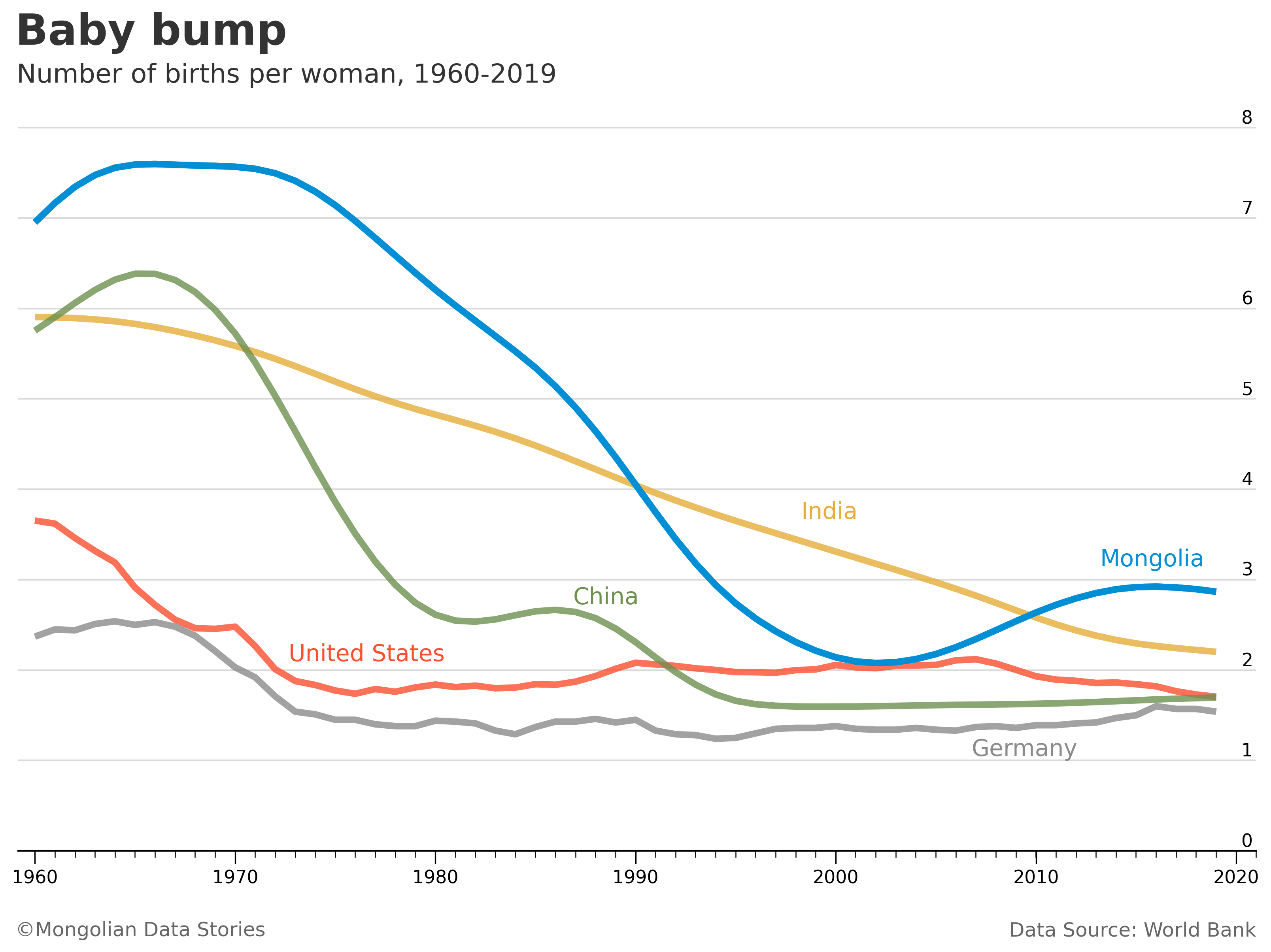 We can see that it is a widespread trend for birth rates to have gone down over time since 1960. Yet around 2005, the trend in Mongolia started going up again. Mongolia today has a similar birth rate to China’s in 1979.