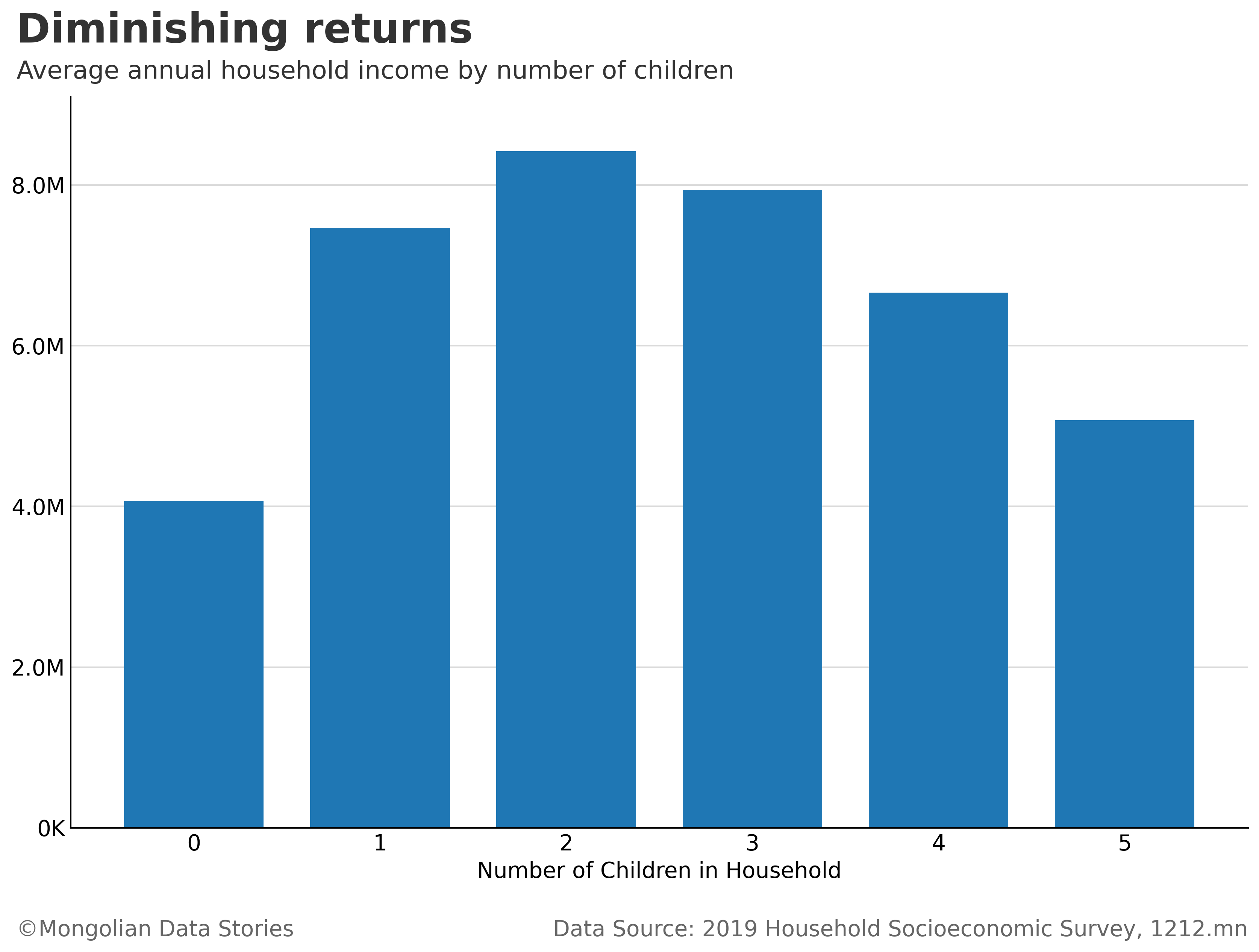 But what about income? Do families with more children make less money? I dug into the 2019 Household Socioeconomic Survey run by the National Statistics Office to answer this. I calculated the average annual household income by the number of children. Let’s take a look.