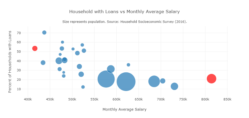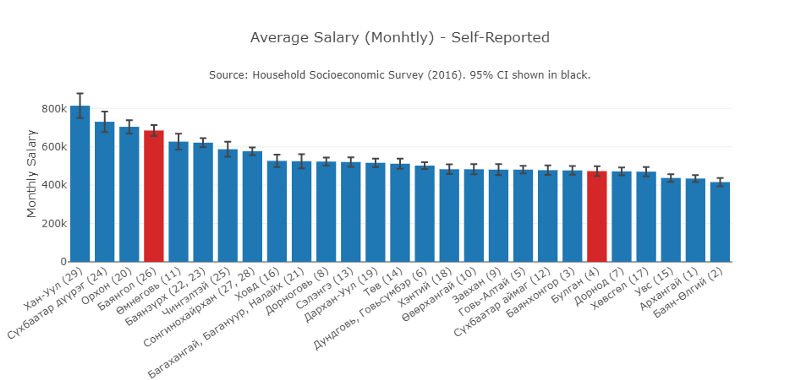 This bubble plot shows the percent of households with loans vs monthly average salaries in each election district. The two highlighted in red are Orkhon (lower right) and Umnugovi (upper left). All of the bubbles above 550k average monthly salary except for the two in red are located in Ulaanbaatar.