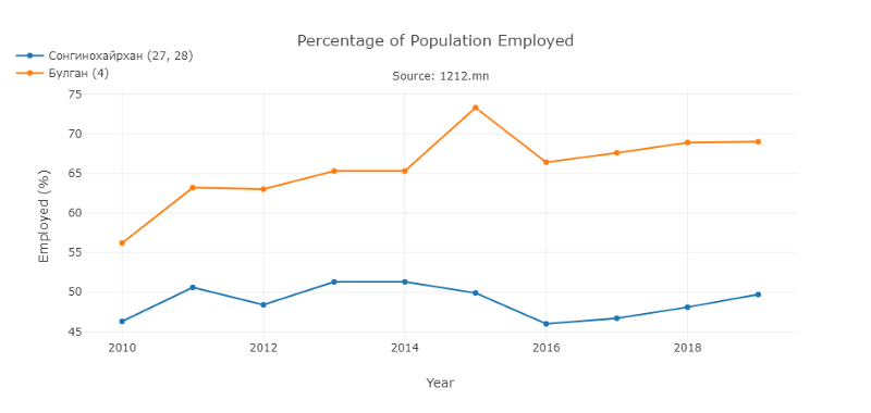 Employment differs significantly as well between Ulaanbaatar and most rural districts. Rural election districts tend to show significantly higher rates of overall employment than the urban ones. In the chart above, the “employed percentage” refers to the proportion of the working-age population that is employed. Urban districts tend to have between 45–55% employment, with rural districts between 65–75%.