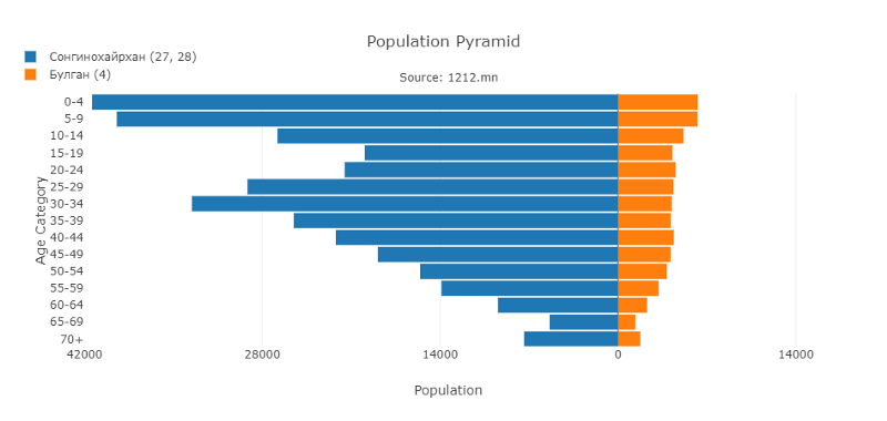 Perhaps the best-known difference in Mongolia is that of Ulaanbaatar and the countryside. The image of busy urban Ulaanbaatar juxtaposed with the bucolic countryside could hardly be more different. Indeed the data shows significant differences in many areas. Let’s compare the population pyramid for the election district with the highest population, Songinokhairkhan District in Ulaanbaatar, with the least populace, Bulgan Aimag.