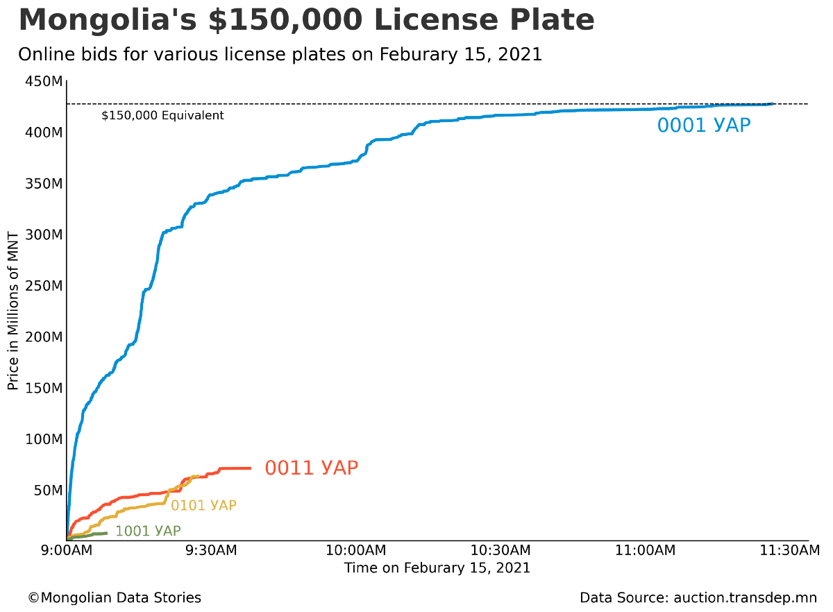 TL:DR Mongolia auctions off a “lucky number” license plate and the bids reach 427.45 million MNT (Mongolian Tugriks) in less than three hours. That’s $150,035.10 USD at current exchange rates.