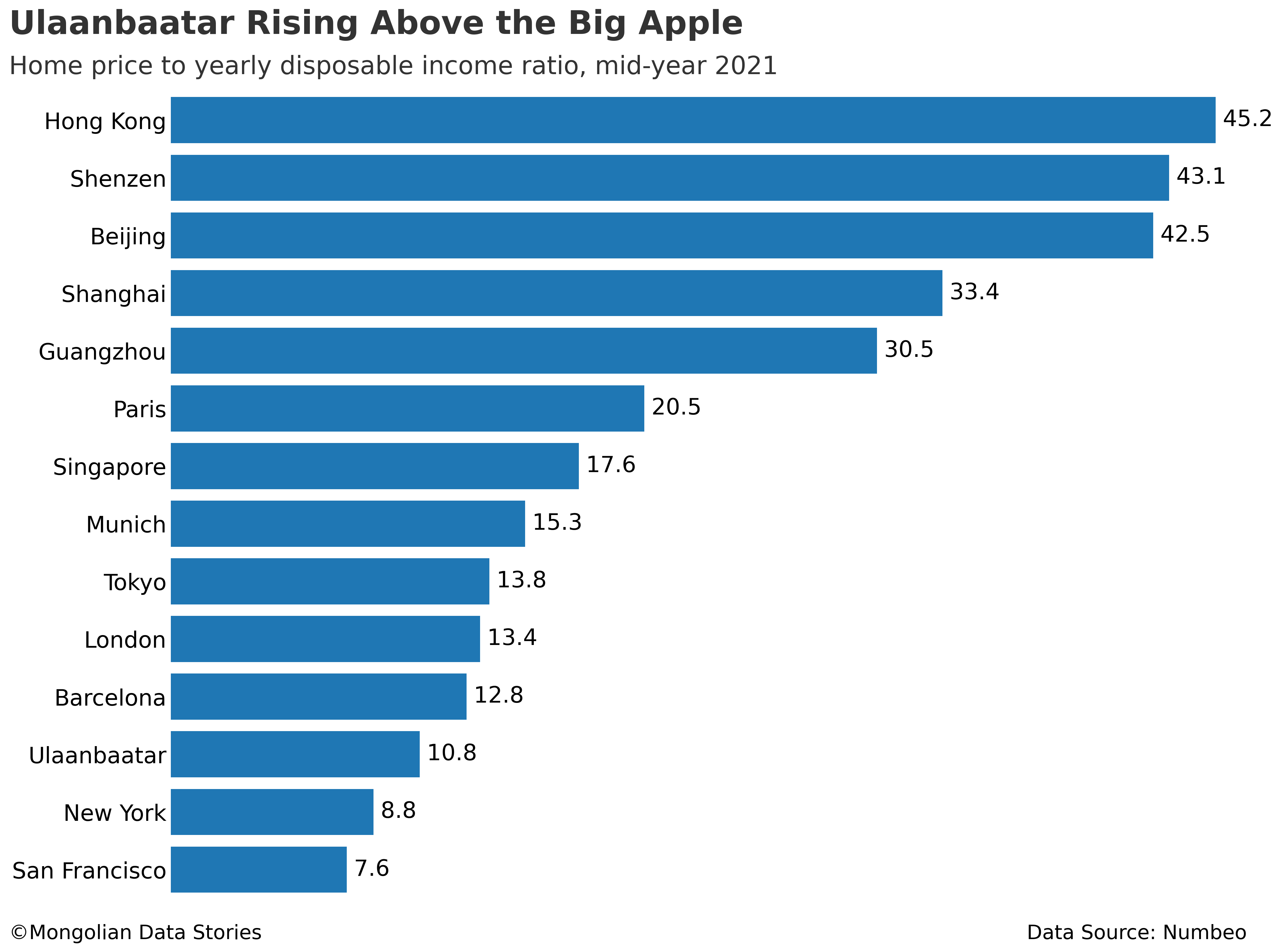 Following the Evergrande debt crisis, Bloomberg published an article showing the price to income ratio for various Chinese cities compared to well known cities around the world. I was asked to take on this chart and see how Ulaanbaatar stacks up with the rest of the world.