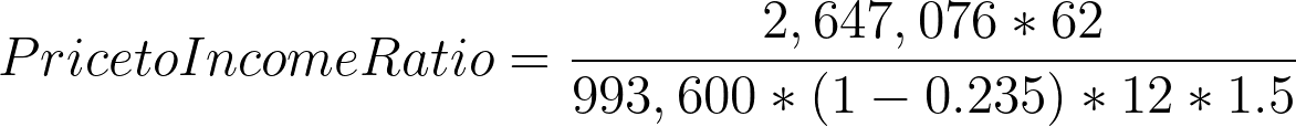 Note: You might think we could simply take the ratio from New York and multiply it by 1.3 (because 62 square meters is about 30% less than 90 square meters). Without knowing whether Numbeo used median or average salary in all circumstances it’s hard to know if we can make a generalized estimate like that.