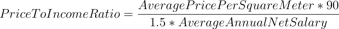 Putting it all together we can take the average price per square meter multiplied by 90 square meters to get the average price of an apartment. Then we take the monthly net salary (average salary minus taxes) and multiply it by 12 months. Then multiply by 1.5 to get the estimated family income. All together: