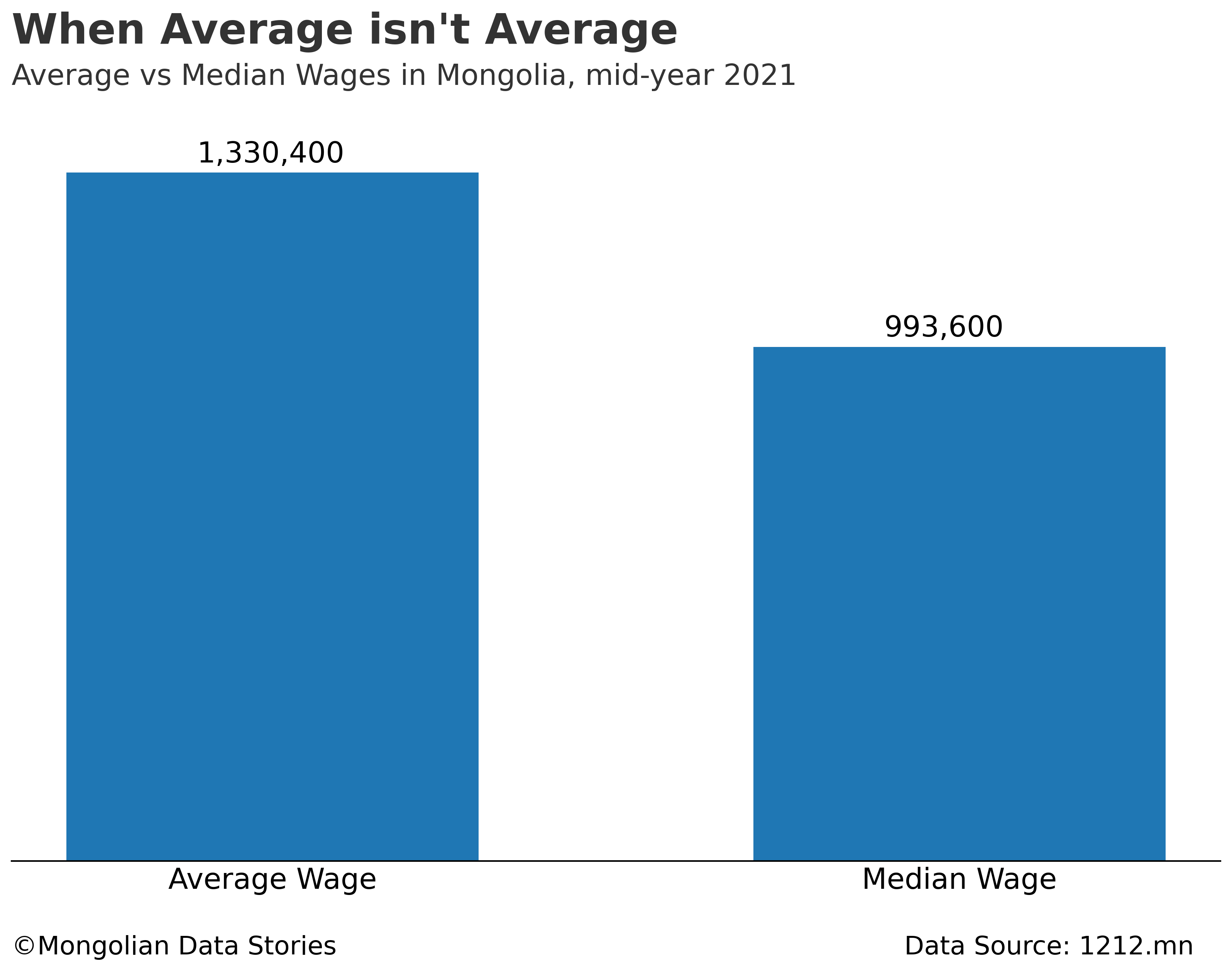 This is due to a small number of high earners skewing the average higher while the median (or middle) salary is lower. While average salary data are available for both Ulaanbaatar and the national level, data for median salary are only available at the national level from the National Statistics Office of Mongolia.